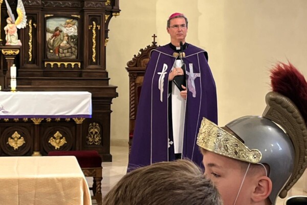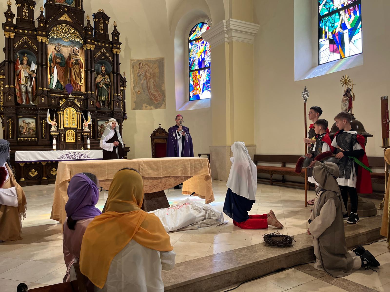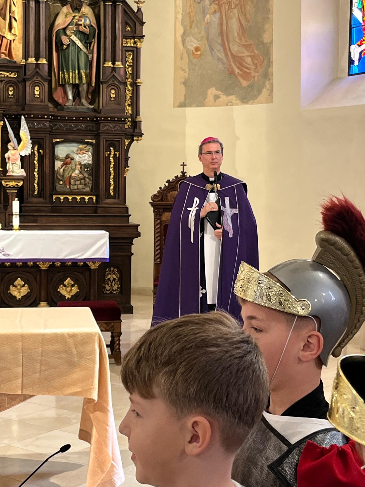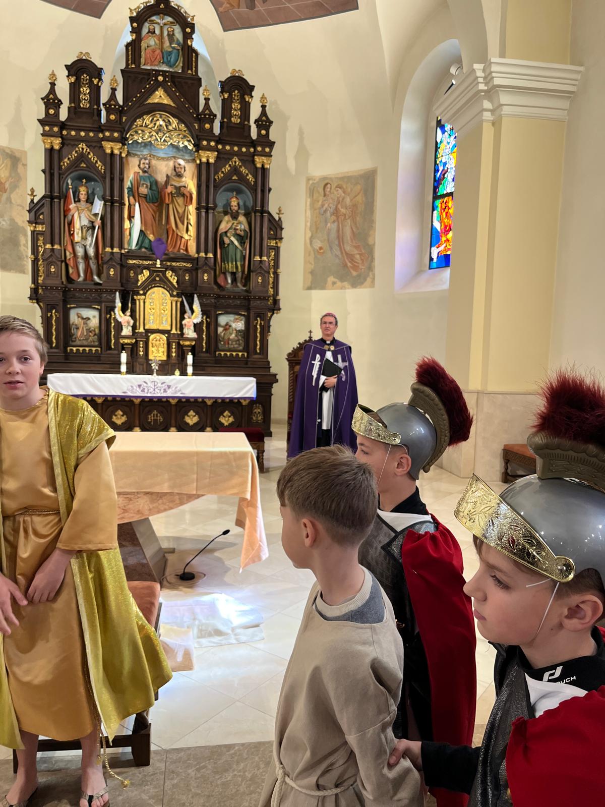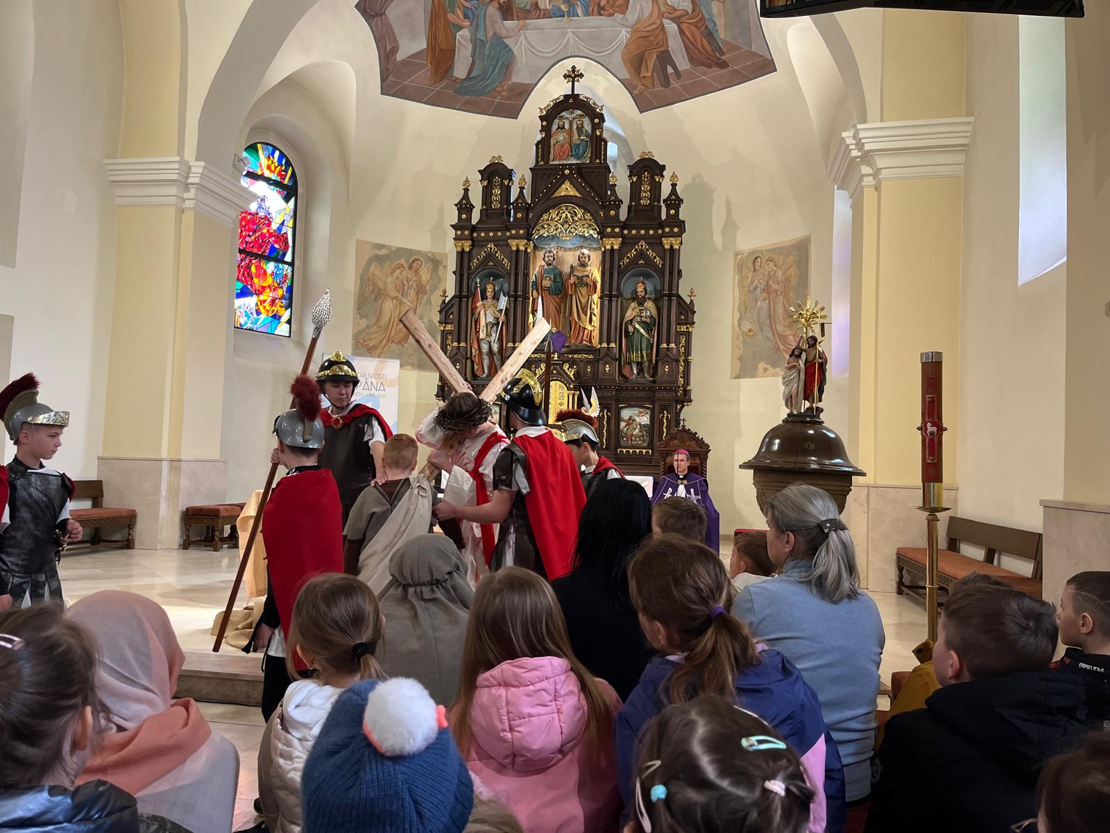 Svojou nečakanou návštevou ich podporil sám diecézny biskup Mons. František Trstenský. Pán biskup sa sám pridal a viedol modlitbu krížovej cesty. Na záver udelil všetkým prítomným, teda žiakom aj učiteľom cirkevnej školy, požehnanie s relikviami sv. Kríža. Osobitne poďakoval účinkujúcim a bol dojatý tým, ako sa naše deti vnorili do modlitby dramatizovanej krížovej cesty. Pre všetkých to bol skutočne nábožný vstup do prežívania Veľkonočného trojdnia.